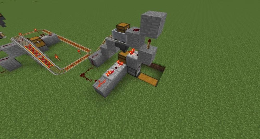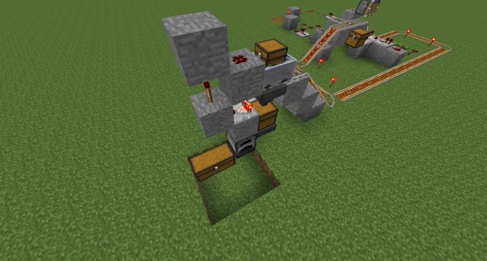 Die Idee ist entstanden, als ich einen Industrieofen vollständig automatisieren wollte (deshalb ist in den Screenshots auch ein Ofen zu sehen – er dient nur der Veranschaulichung und ist kein notwendiger Teil der Anlage). Ich wollte es so einrichten, dass der Ofen permanent und ohne mein Zutun mit Kohle versorgt wird. Die Kohle gelangt über eine Truhe in den Ofen. Solange sie Items hat, gibt die Truhe ein Signal aus, das ich invertiere und dazu benutze, die Antriebsschienen am Ofen dann anzuschalten, wenn die Truhe leer ist. Daraufhin fährt die Lore zum Befüller, wo sie über einen Piston angehalten und aus der Kohlenlagertruhe befüllt wird. Dies erfolgt über die erste Sensorschiene, deren Signal beim Überfahren in eine Speicherzelle geleitet wird. Dadurch bleibt der Piston dauerhaft ausgefahren. Der Piston wiederum ist nötig, weil man zum Auslesen des Füllstandes der Lore eine Sensorschiene braucht – zum Losfahren der Lore bräuchte man aber eine Antriebsschiene. Also wird die Lore von dem Piston über der zweiten Sensorschiene am Hang angehalten. Der Füllstand der Lore wird über diese Sensorschiene und einen an sie angeschlossenen Komparator ausgelesen und mit dem Füllstand der Vergleichstruhe verglichen. So kann eingestellt werden, mit wievielen Items die Lore befüllt werden soll. Ist der Füllstand von Lore und Vergleichstruhe gleich, lässt der Komparator das Signal durch, mit dem zum Einen die Speicherzelle resettet und zum Anderen der Piston wieder eingefahren wird – die Lore fährt der Schwerkraft folgend am Hang hinunter und erreicht wieder die Truhe am Ofen, wo sie den Nachschub abliefert und wartet, bis die Truhe wieder leer ist.