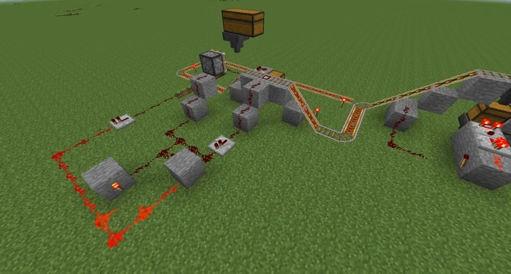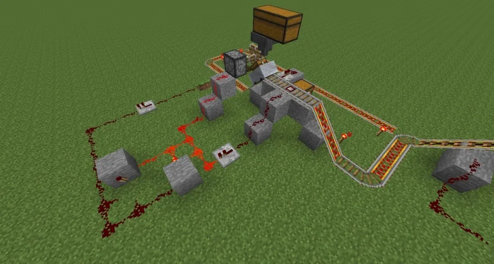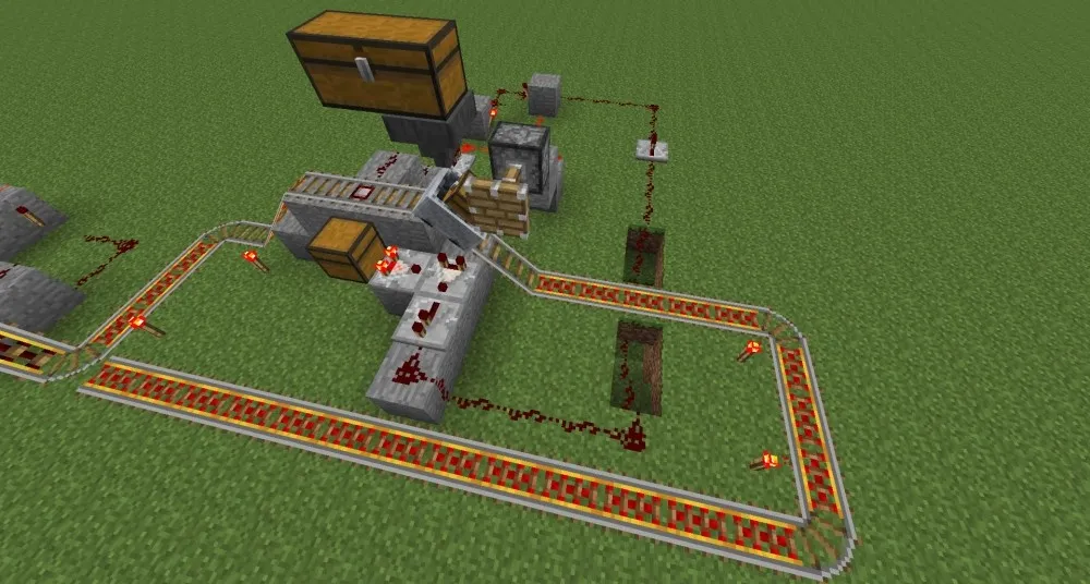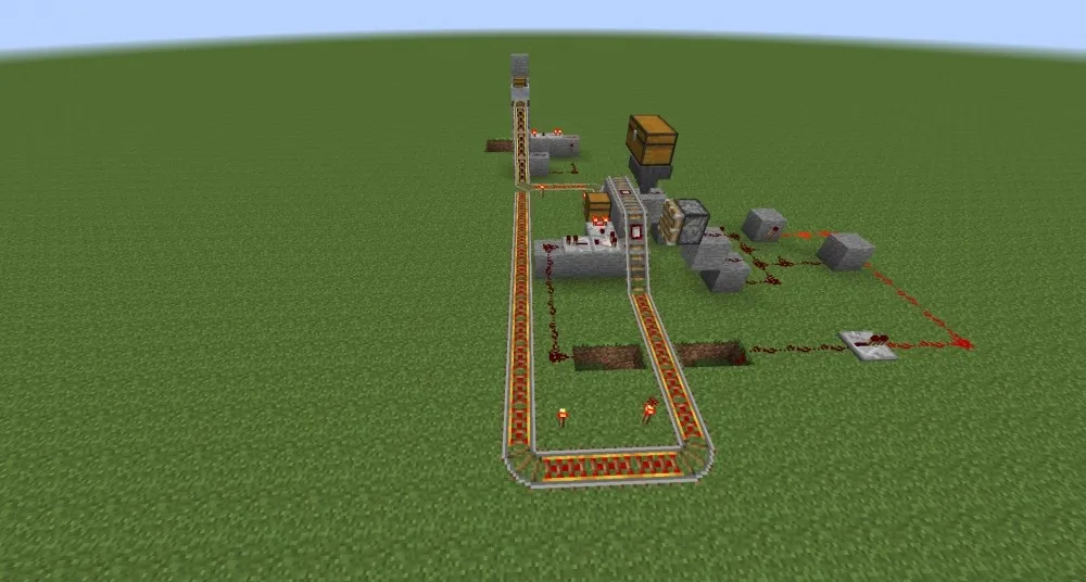 Automatisiertes Nachschubsystem, bei dem eine Lore losgeschickt wird, sobald eine Truhe leer ist. Die Lore wird automatisch bis zu einem eingestellten Füllstand befüllt und kehrt dann zu der leeren Truhe zurück.