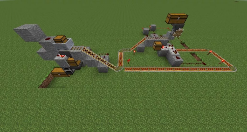 Automatisiertes Nachschubsystem, bei dem eine Lore losgeschickt wird, sobald eine Truhe leer ist. Die Lore wird automatisch bis zu einem eingestellten Füllstand befüllt und kehrt dann zu der leeren Truhe zurück.