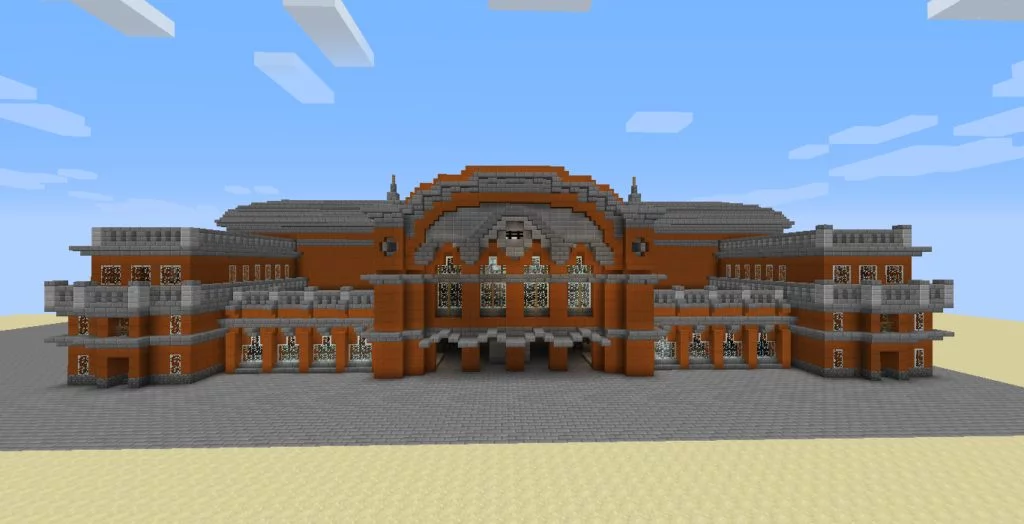 Als erstes baut man den linken oder rechten Turm des Haupteingangs und arbeitet sich dann zur jeweils anderen Seite vor, indem man zuerst die Eingänge baut und später die Bögen und anschließend den Rahmen für das Dach darübersetzt. Dann sollte zunächst nur die vordere Wand stehen. Danach baut man die Verbindungsteile und die vorderen Teile der Seitenflügel. Anschließend baut man das Dach über die Gleise und verbindet dann den Rahmen des Hauptdaches mit dem Gleisdach. In das Dach der Gleise werden nun Eisengitter abgebracht, welche nur einen Block nach unten reichen und sich alle 3 Blöcke wiederholen, sodass sie hinterher das gesamte Dach abstützen sollten. An den Seiten baut man nun Glas ein, um das Dach auszufüllen (siehe Bild 3) jedoch nur so weit, dass noch Züge hinein und hinauskommen. Abschließend können die Wände und geraden Dächer geschlossen werden. Der hintere Ausgang des Gebäudes kann wieder mit Bögen ausgestaltet werden, oder man baut den Hauptteil der hinteren Wand zu und lässt nur ein paar Blöcke frei für Bögen. (siehe Bild 4) [caption id="attachment_12904" align="alignnone" width="300"]