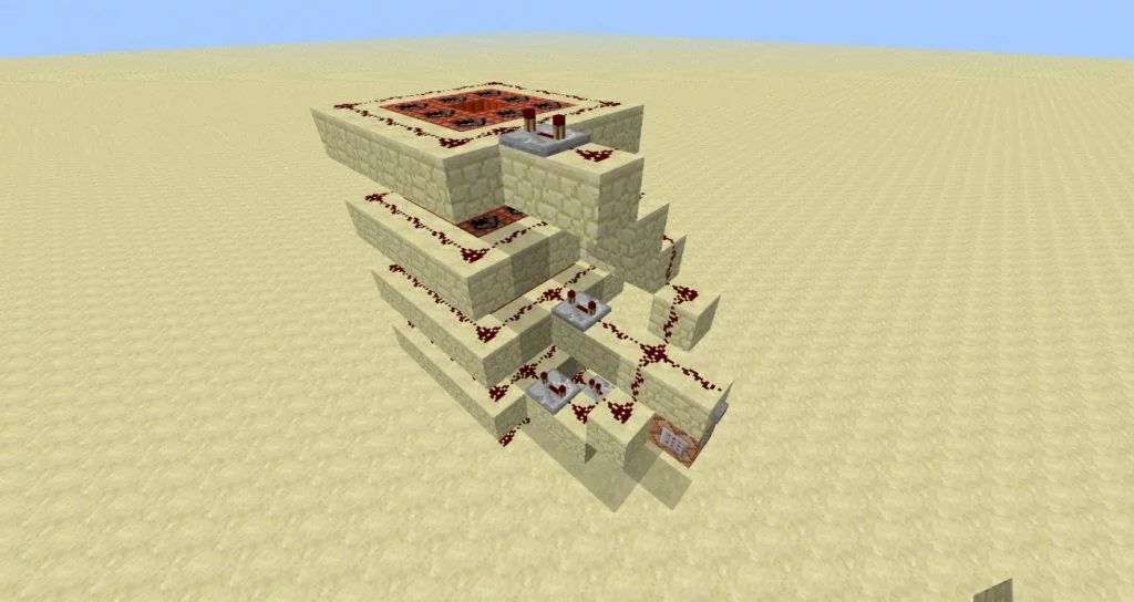 The machine consists of five decks à eight TNT, to ignite them, I have the individual decks in the middle (at deck three) connected and provided with repeaters, because the redstone signal is too weak, to get inside I thought of nothing better than to teleport in, vll. jmd. finds a more elegant solution. With seven decks of 8 TNT (=56 TNT) you reach 850, with nine decks of 8 TNT (=72 TNT) you reach 1300 (my record is 1325). How high do you get?