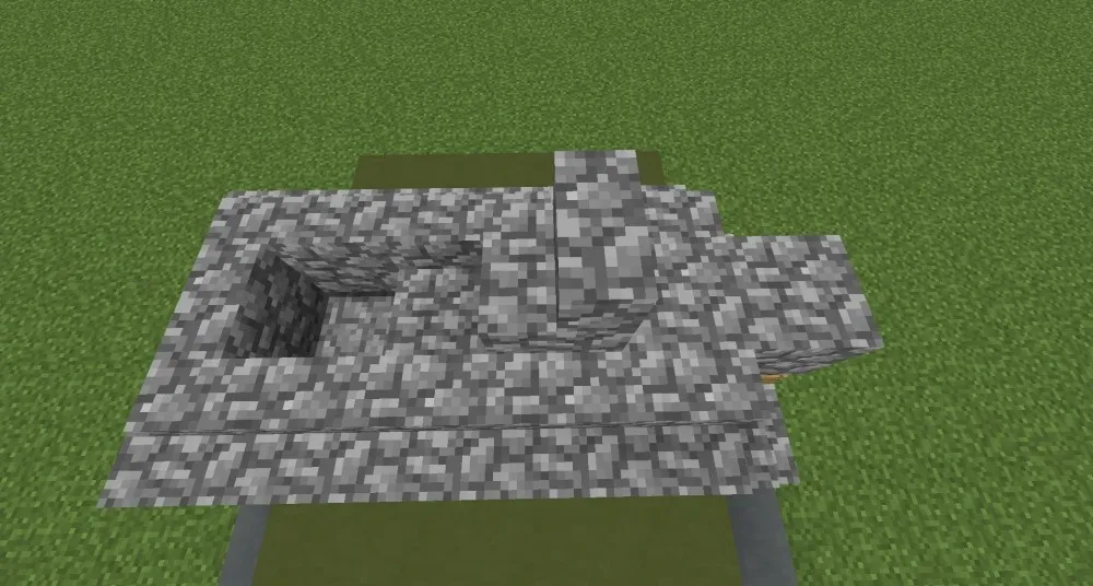 Danach verbindet man beide Seiten,indem man umgekehrte Stufen zwischen denen platziert.Auf der hinteren Seite kommen auf die umgekehrten Stufen normale Stufen,sodass sich deren Unterseiten berühren.Vorne macht man dasselbe,nur kommen hinter die äußeren Stufen zwei Lehmblöcke.Die mittlere Stufe wird wieder entfernt.