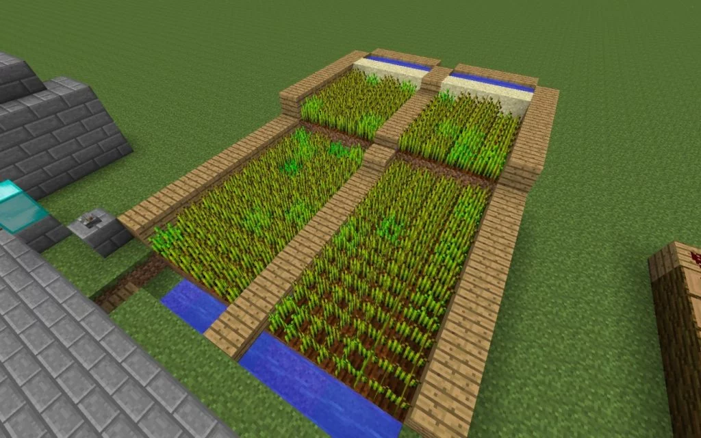 Das Feld lässt sich im Prinzip unendlich groß bauen, man muss nur bedenken, dass man das Getreide nach dem ernten wieder nachpflanzen muss, worauf man nicht immer unbedingt Lust hat.Beim Bau muss man beachten, dass die Stufen in den Feldern eine Länge von 7 Blöcken haben, da Wasser nur 8 Blöcke weit fließt und noch zur nächsten Stufe gelangen muss. Außerdem müssen die Felder bewässert werden, damit das Getreide nicht eingeht. Daher baut man am besten in der Mitte einen Kanal mit Wasser, welchen man aber abdecken muss, z.B. mit Stufen, sodass man darauf auch laufen kann. Ein Wasserblock bewässert alle umliegenden Blöcke in einem Radius von 4 Blöcken.