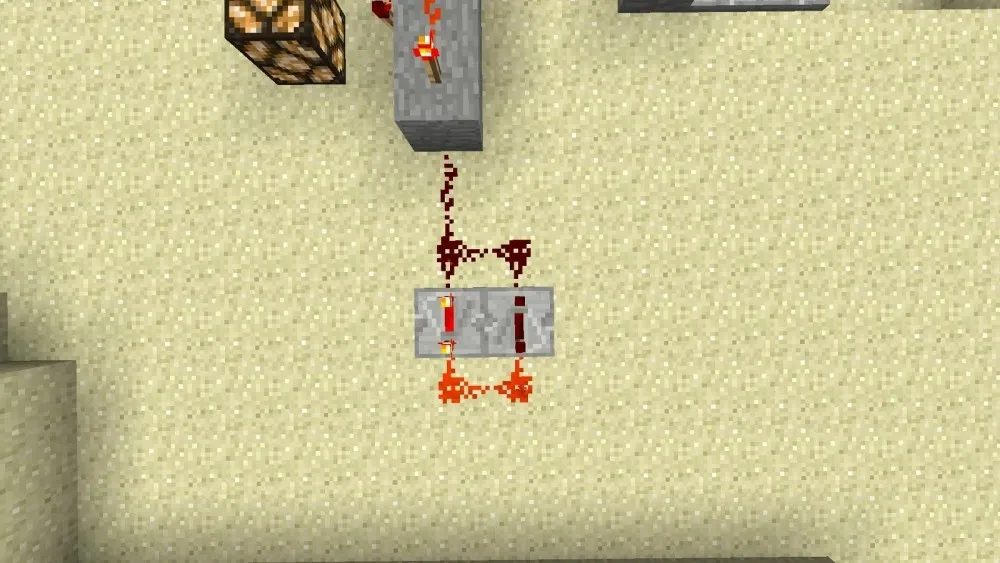 UND Gatter mit 2 Eingängen und dem Ausgang (Redstone Lampe) – wichtig ist das zwischen den Fackeln Redstone ist und links auch noch die Fackel gesetzt wird: