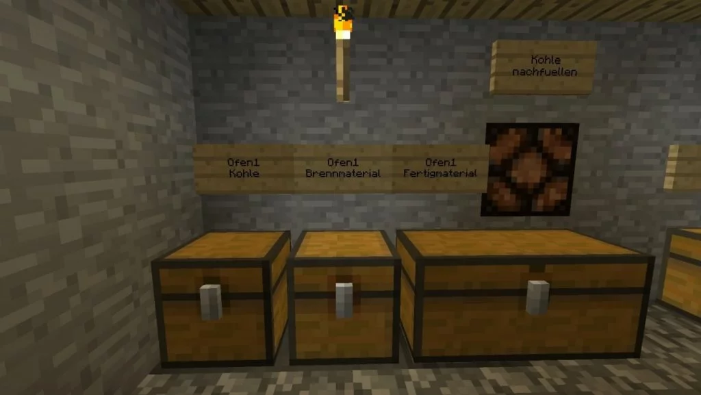 In meiner Version sind hinter der Truhe 3 Trichter – muss also erst ohne Ende Kohle einfüllen damit die Lampe nicht zu früh das Signal kriegt, daher hab ich letzten Trichter vor dem Ofen genommen, funktioniert aber genau so gut…
