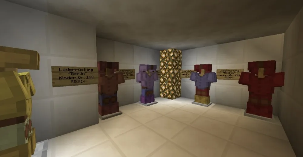Alle Geschäfte sind voll ausgestattet mit Produkten, Werbung, Glowstones, Angeboten, Preisen, …