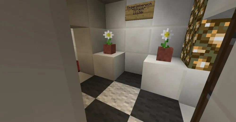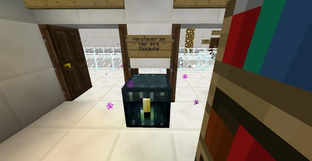 Besonders gut ist die Idee mit den Endertruhen! Muss man nicht ein volles Inventar mit sich rumschleppen. Man könnte bunte Shulkerkisten ( neu in der 1.11 ) als Einkaufstaschen verwenden.