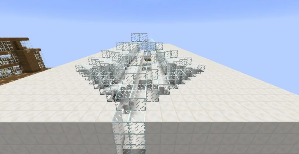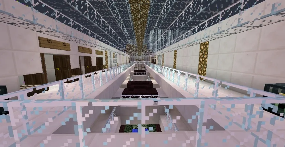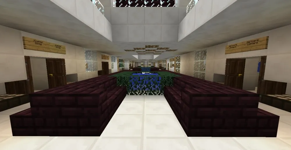 Ein Springbrunnen ist über die Galerie aus allen Geschossen zu sehen. Eine Treppe befindet sich in der Mitte des Gebäudes. Es gibt zwei Eingänge: Einen Haupt- und einen Nebeneingang sowie Dachterassen auf beiden Seiten der mittigen Kuppel. Nachdem man ein "Produkt" erworben hat, kann man seine Einkäufe o.Ä. in einer Endertruhe verstauen und z.B. in seinem Hotelzimmer, aber auch in allen anderen Geschäften darauf zugreifen.
