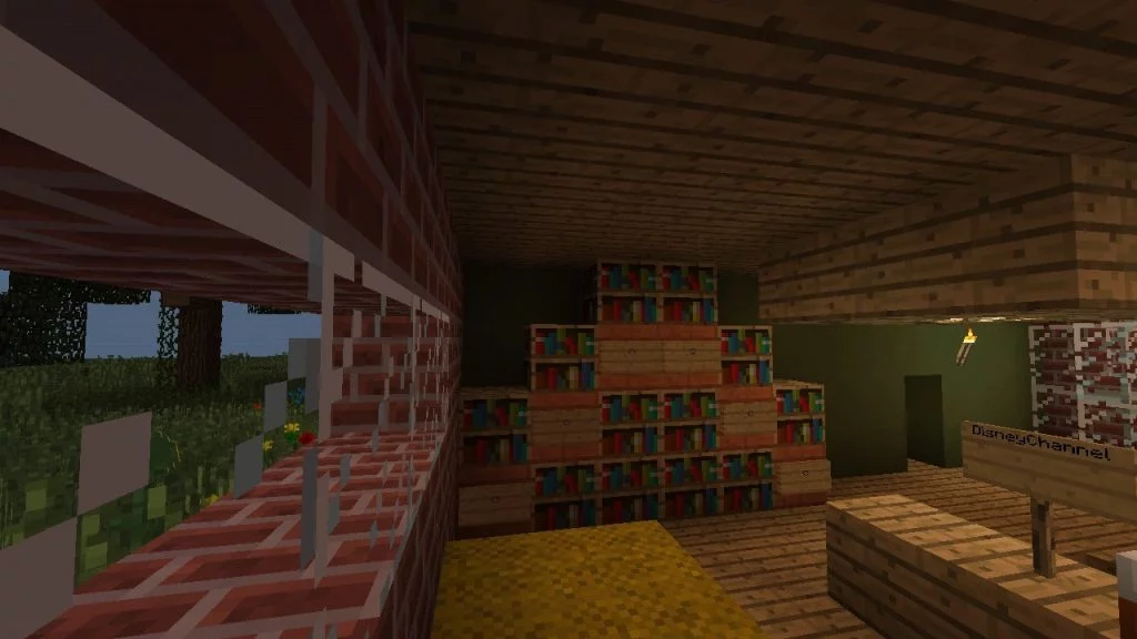 Dies ist ein Bücheregal in der Form einer Pyramide und auch ein kleiner Blickfang. Die Schilder sollen geschlossene Schubladen darstellen,