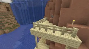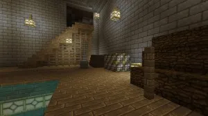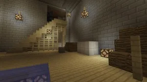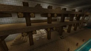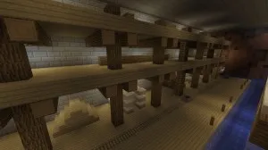 Auf der gegenüberliegenden Wandseite befindet sich ein Gerüst, um mehr Platz zum arbeiten zu haben und dient zusätzlich zur Materialablage. Auch hier sind überall Redstonelampen angebracht!