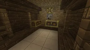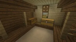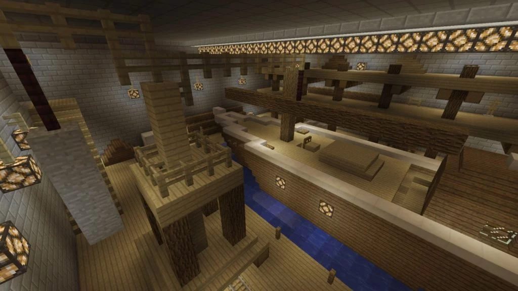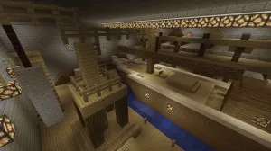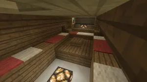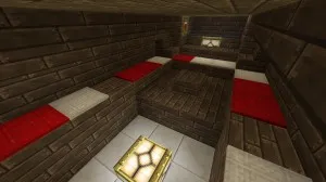 Zum Schluss noch der Innenbereich des Schiffes, wo sich Schlafplätze und ein kleines Lager befindet. Hier sind auch wieder ein paar Redstonelampen verbaut um auch den Innenbeeich auszuleuchten.
