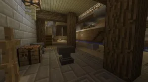 Vom Eingang aus angefangen, befindet sich an der linken Wand eine kleine Schmiede wo man Metall verarbeiten kann und eine Werkbank.