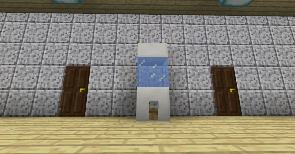 Der Wasserspender besteht aus einem beliebigen Block, einer beliebigen Stufe, einem Block Eis und einem Haken. Man kann statt dem Eis auch Packeis nehmen, damit es nicht schmilzt, aber ich finde Eis schöner, da es durchsichtig ist. Statt dem Haken kann man auch einen Hebel nehmen.